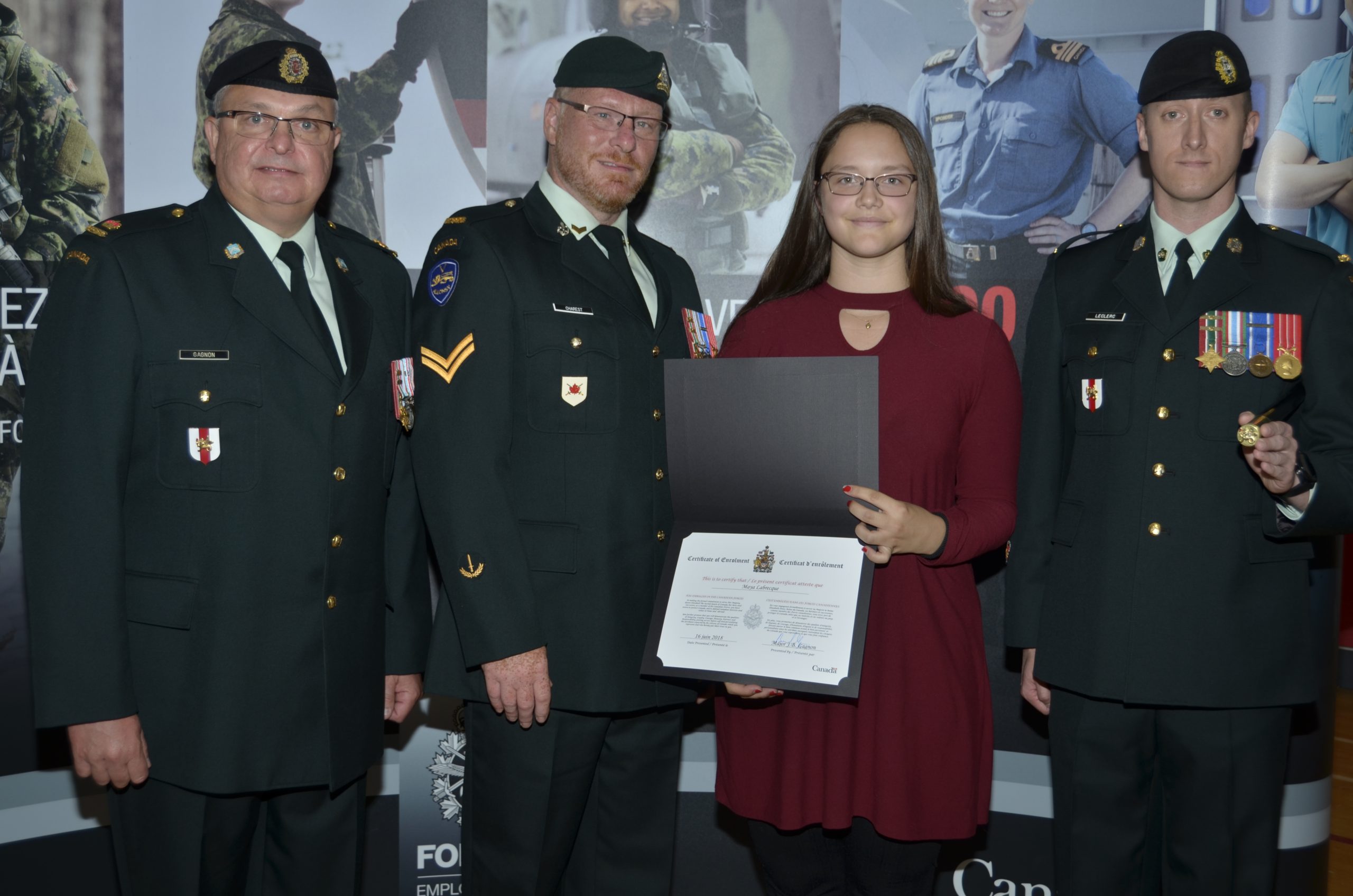 Les parents de la jeune fille tiennent à saluer la persévérance de Maya qui, ont-ils souligné, a toujours démontré une amélioration et des efforts constants au cours de son secondaire. De par ses cinq années d’implication au sein du CCMRC Bellechasse, elle a participé à trois camps d’été à la base militaire de Bagotville (deux semaines, trois semaines et six semaines), recevant plusieurs décorations, grades, médailles et trophées.