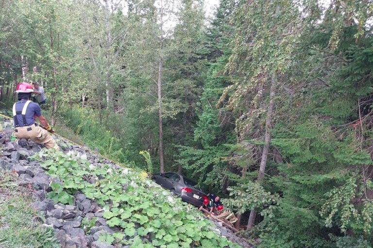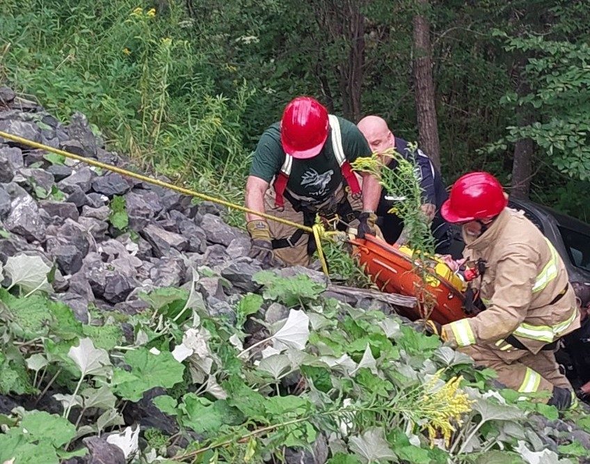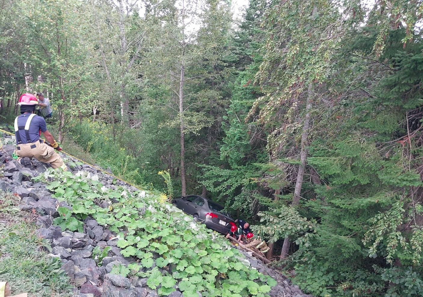 FAITS DIVERS. Pompiers et ambulanciers sont intervenus en après-midi, le dimanche 11 août, afin de secourir une dame dont la voiture avant chuté derrière un ravin derrière le marché Metro de Lac-Etchemin.