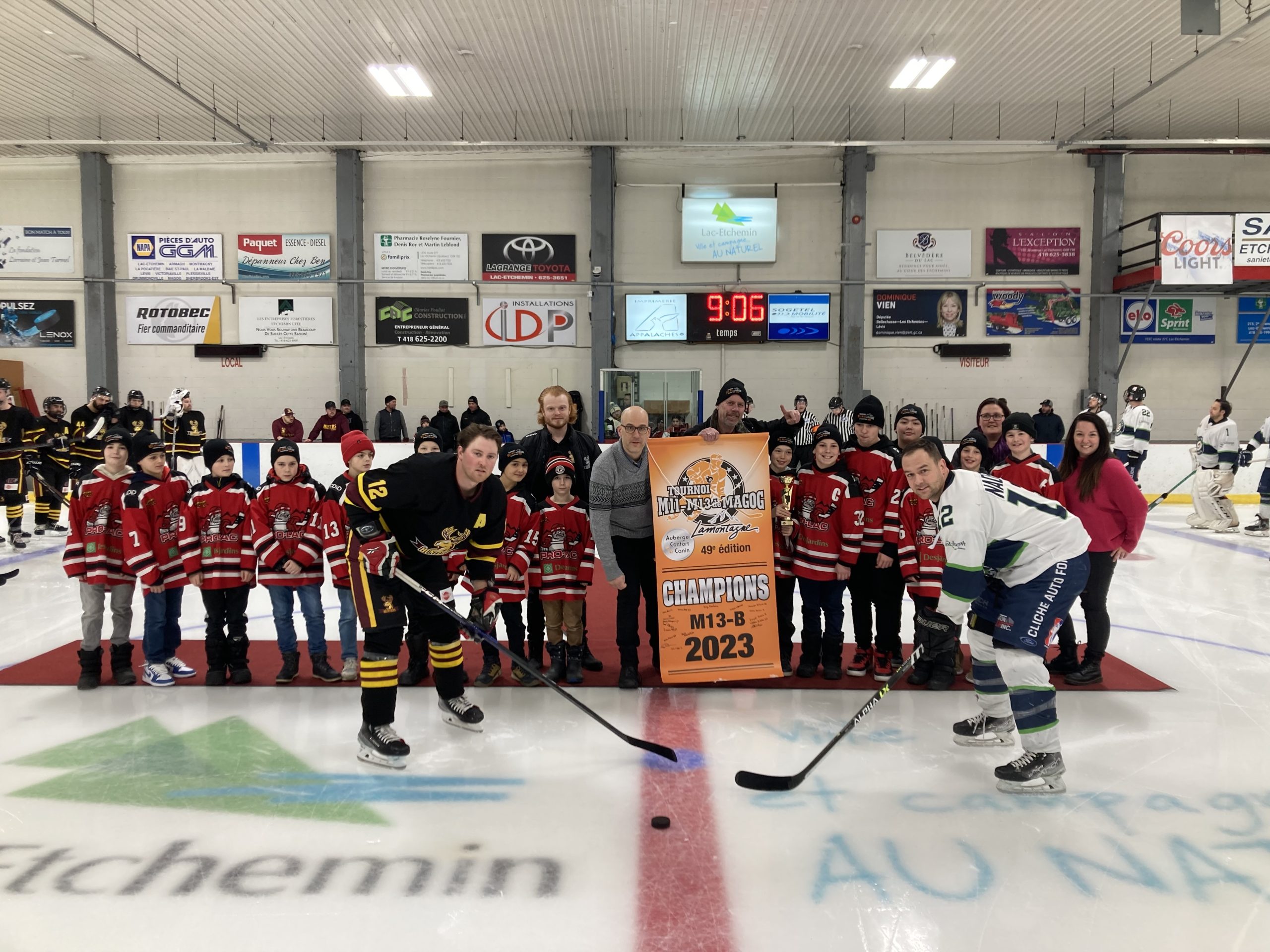Soulignons que les Hunters ont profité de cette soirée pour accueillir gratuitement tous les joueurs du hockey mineur etcheminois qui portaient leur chandail à leur arrivée à l’aréna. Les joueurs de la formation M13B, champions du récent tournoi de Magog, ont aussi été présentés au centre de la glace avant le début de la rencontre.